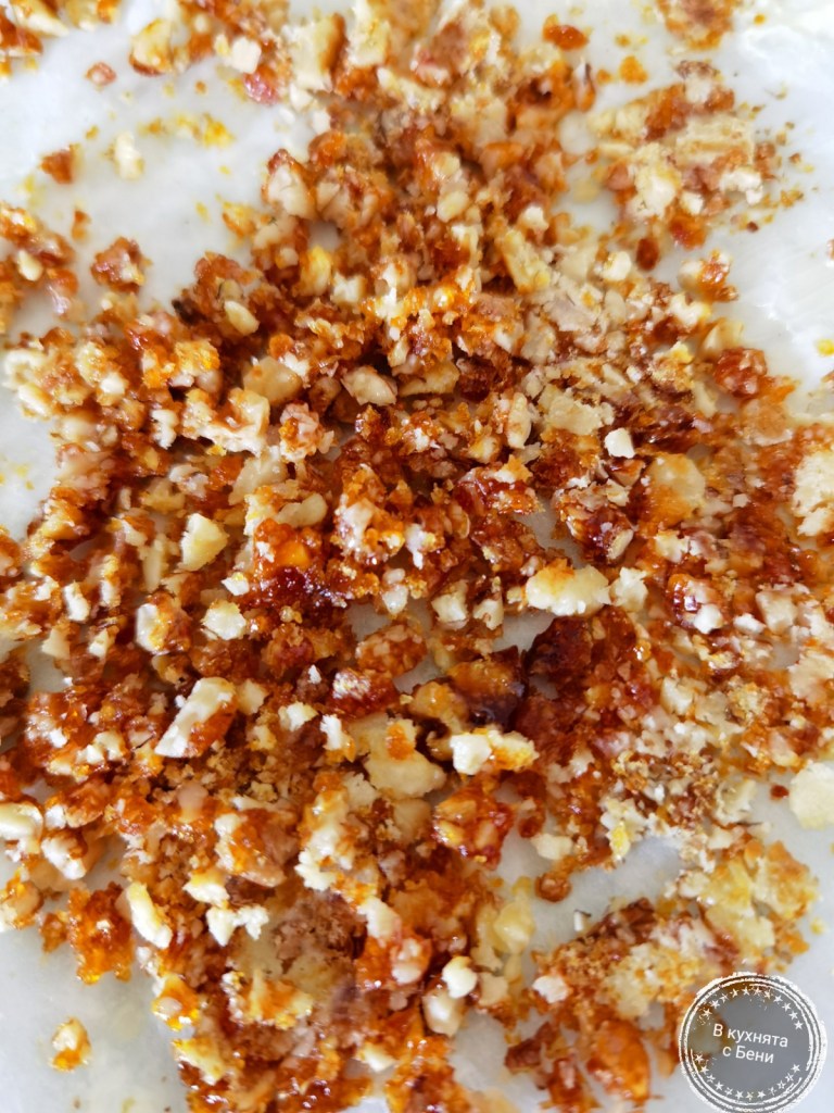 В малък тиган карамелизирах захарта за крокана и когато се получи гладък карамел, добавих нарязаните на дребно орехови ядки. Разбърках ги и бързо разположих върху парче хартия за печене, намазано с масло. Оставих ги да изстинат и счуках да дребно.