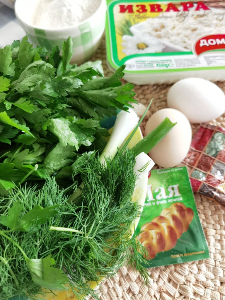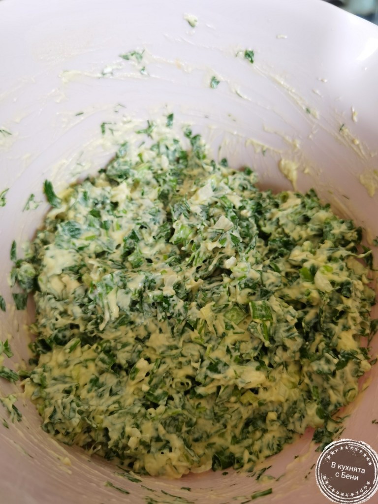 В купа сложих яйцата, солта, пипера, чесъна, брашното с разбърканата в него мая и изварата. Разбърках до гладка смес, като използвах кухненска бъркалка. След това добавих нарязаните зелении и разбърках добре. Прибрах сместа в хладилник за 15 минути.