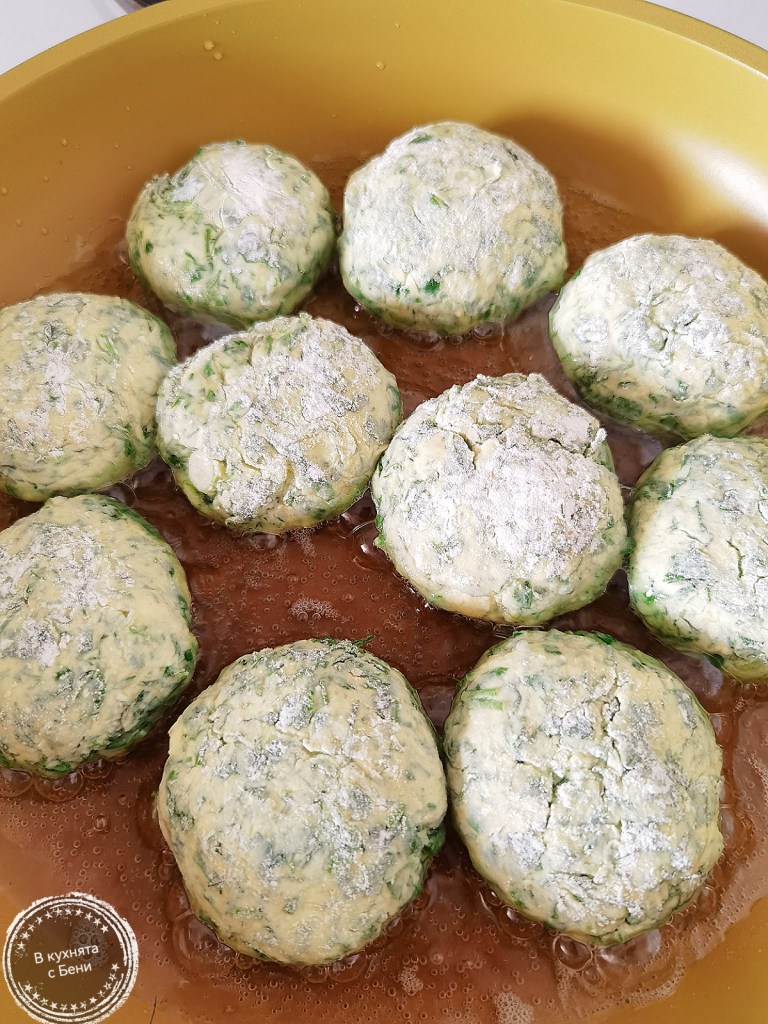 В тиган с незалепващо керамично покритие загрях олио с височина един пръст. Степента на котлона бе 4 от 6 на моята печка. Сложих кюфтетата и ги пържих до апетитен загар от двете страни. Бяха нужни около 7 минути на страна. Обърнах ги три пъти по време на пърженето. Готовите кюфтета извадих в чиния, покрита с домакинска хартия.