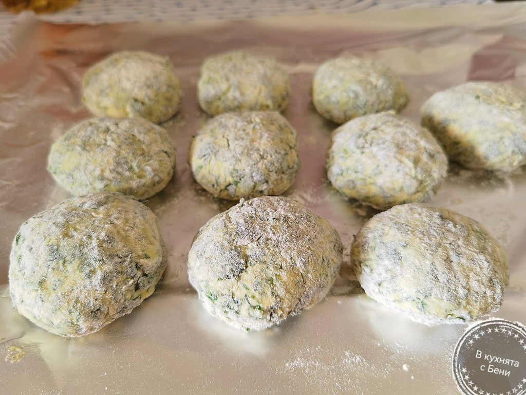 Подготвих парче алуминиево фолио, върху което сложих около половин чаша брашно. С набрашнени ръце взех от сместа, оформих кюфте, което овалях добре в брашното. Сложих го настрана и така приготвих и останалите. Получиха се 10 бр. с диаметър около 6 см. Сместа е лесна за работа.