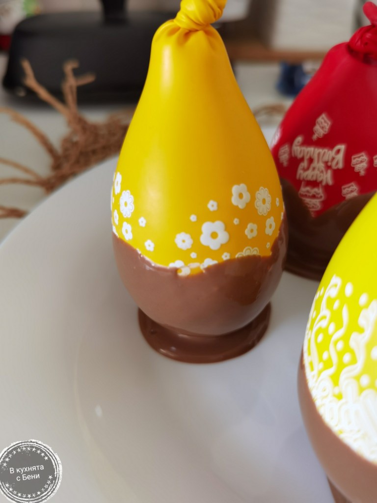 На водна баня разтопих шоколада. Оставих го съвсем леко да се охлади. Балоните надух, но не много, за да получа малки чашки. Ако ги надуете повече, ще се получат шоколадови купички, а и ще направите 2 или най-много 3 броя. На дъното на чиния сложих малко от шоколада. Потопих първия балон в купата с течния шоколад, след което го отцедих и поставих върху шоколадовата подложка в чинията. Когато се закрепи устойчиво, продължих с останалите. След като всички бяха готови, ги прибрах в хладилника за около 1 час, за да стегне шоколада много добре.