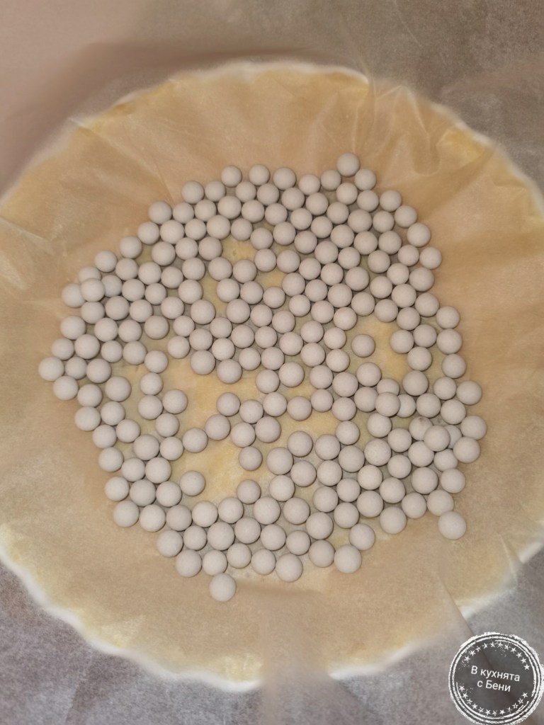 Брашното пресях и сложих в купа. Добавих солта и разбърках. Маслото е студено, но постояло за 15 минути на стайна температура. Нарязах го на парченца и добавих в купата. С ръка започнах да разбърквам, оформяйки маслени трохи. Добавих студената вода и омесих за кратко до оформянето на топка. Не трябва да се меси повече от това. Увих тестото във фолио за свежо съхранение, притиснах го във формата на диск и прибрах за 1 час в хладилника. След това време го освободих от фолиото и разположих между два листа хартия за печене, като така го разточих до размера на формата, която е с диаметър 25 см. В краищата тестото се напука, но това не бива да ви притеснява. Намазах формата с масло и внимателно разположих в нея тестото, като го вдигнах и уплътних по стените на съда. Никога не мога да направя хубав борд, но това не ме притеснява особено. Дъното надупчих на места с помощта на вилица. Междувременно загрях фурната на 190 градуса. Върху така оформената основа сложих един от използваните листове хартия и изсипах тежестите за печене. Сложих да се пече в добре загрятата фурна за 30 минути. На 15-тата минута премахнах хартията и тежестите и допекох до лек загар. Оставих леко да се охлади, докато приготвих пълнежа.