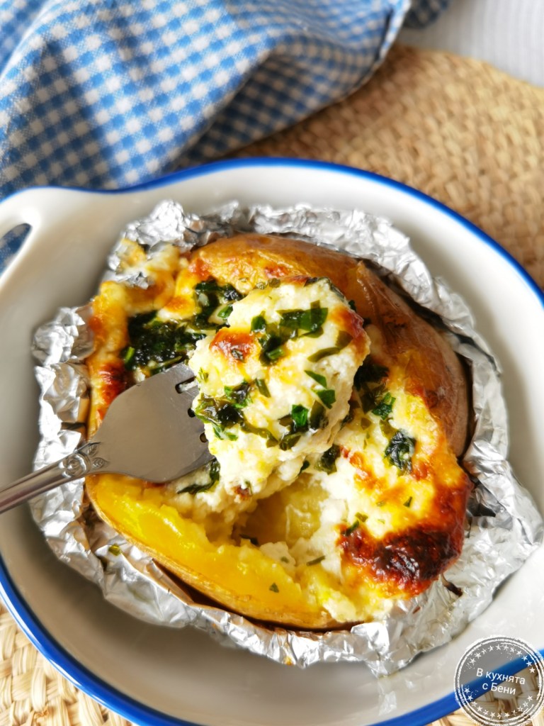 Картофите измих добре, подсуших и с вилица набодох от всички страни. Намазах ги с олио и посолих. Увих ги в парче алуминиево фолио, така че после лесно да го отворя, за да напълня картофите. Разположих ги в тава и сложих да се пекат в напълно загрята на 190 градуса фурна. Пекох ги 1 час и 15 минути, като готовността им проверих, като прободох с дълго дървено шишче, което трябва с лекота да навлиза в картофа. Прободох директно през фолиото. Готовността зависи от вида на картофите и от големината им, така че съобразете с това. Извадих тавичката и докато фолиото леко се охлади, в купичка смесих настъргания кашкавал с топеното сирене, а в друга намачках овчето сирене. Внимателно отворих фолиото на първия картоф. Разрязах го на две и леко разделих половините. Намачках с малка виличка, посолих, полях с лъжицата прясно мляко и добавих лъжицата масло. Намачках още малко, като са стараех да обхвана максимално повече от вътрешността на картофа и добавих сиренето, след което поръсих с шарената сол. На финал сложих около 3 лъжици от другата смес с кашкавала и топеното сирене. За да остане стегнат картофа, оформих около него фолиото, за да го придържа като купичка. Сложих картофа в тавата и продължих с останалите. При мен остана малко от кашкавалената смес, която разпределих по равно върху всички картофи. Скарата на фурната качих едно ниво нагоре и сложих тавата. Пекох картофите около 20 минути, или докато добиха апетитен загар. През това време в канче загрях маслото, ситно нарязания магданоз, малка щипка сол и пресования чесън. Оставих да ври половин минута и го отстраних от котлона.