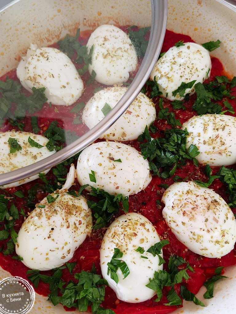 Яйцата сварих до твърдост за 9 минути, леко охладих и обелих. В дълбок тиган с незалепващо керамично покритие загрях маслото и олиото. Добавих парченцата чушка и готвих 6-7 минути, след което върху тях подредих на един плътен ред доматите. Посолих леко и след още 6 минути готвене под капак на 4 от 6 степени на моята печка, сложих разрязаните на половинки яйца, с плоската част надолу. Посолих ли съвсем леко, поръсих с ригана и между тях разположих ситно нарязан магданоз. Отгоре разпределих настъргания кашкавал, сложих капака и готвих на 3 степен за около 10 минути или до видима готовност и разтопяване на кашкавала.