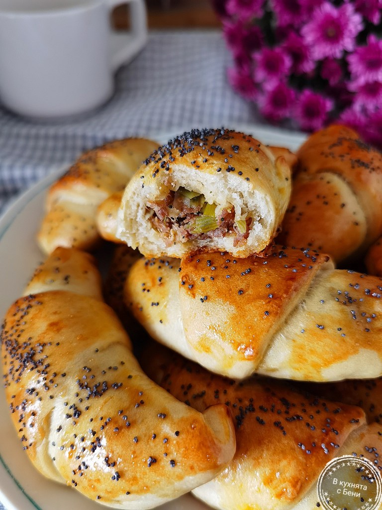 Времето навън предразполага към домашен уют и затова по-рано днес изпекох тези чудни кифлички с мляно месо и праз, които се получиха много вкусни. 😋🥐😍☔️ Приготвят се лесно и бързо и със сигурност ще ви харесат, особено ако обичате праз. 👌☺️