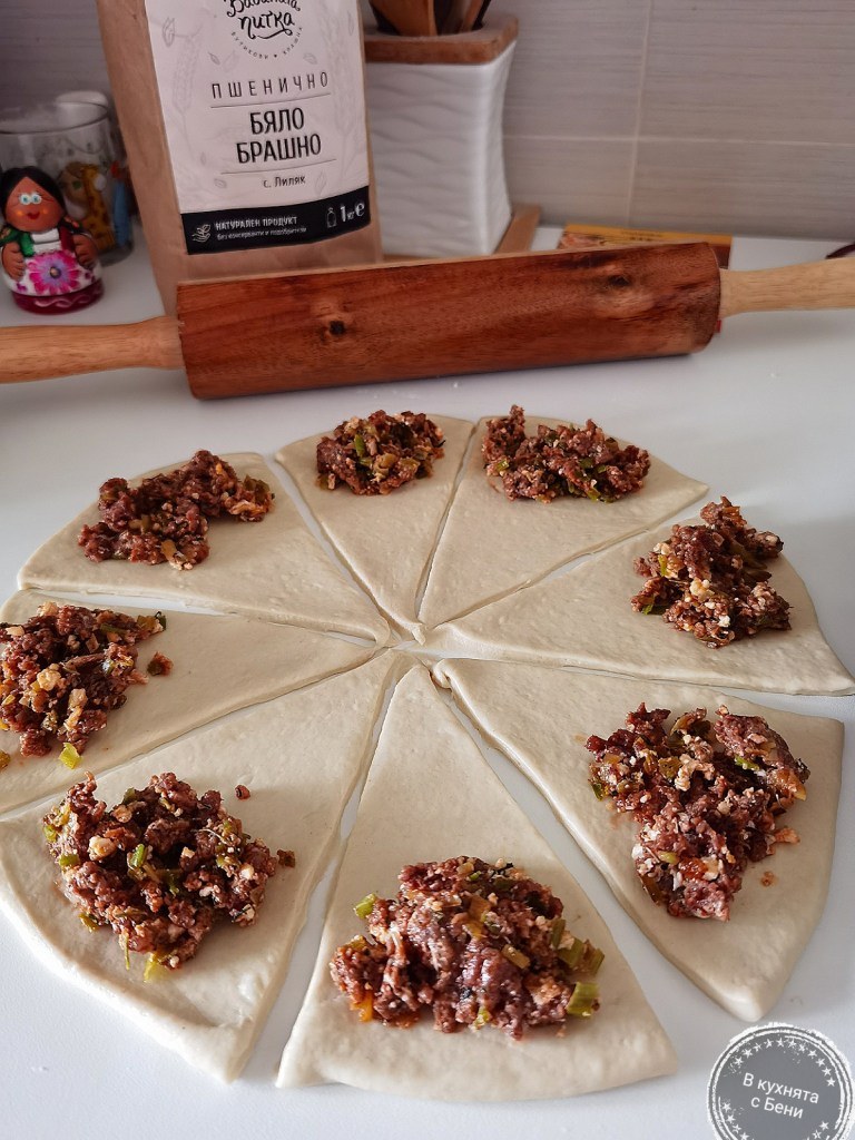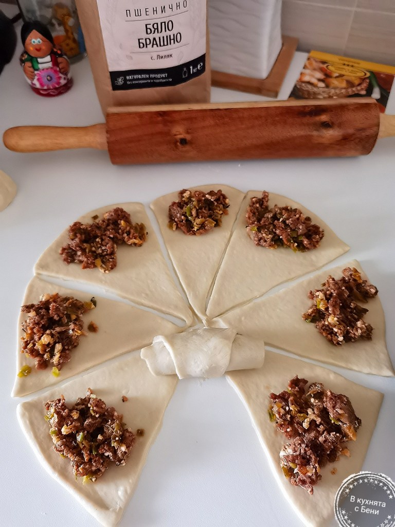 Към брашното в купата добавих солта и разбърках. Добавих вече шупналата мая, олиото и оцета. Разбърках добре и прехвърлих на леко набрашнен плот, като за кратко омесих меко тесто. Не е добре да се добавя още много брашно, а само ако лепне. Разделих го на две равни части. Първата разточих на тънък кръг с дебелина около 2 мм. С остър нож го разрязах първо на 4, а след това на още 4 сравнително равни триъгълника. В широката част на всеки сложих от сместа в тигана и навих под формата на кифличка. Постарах се да сложа повече плънка, за да не преобладава тестото. Никога не ми се получават с перфектна форма, но за радост това не влияе на вкуса.
