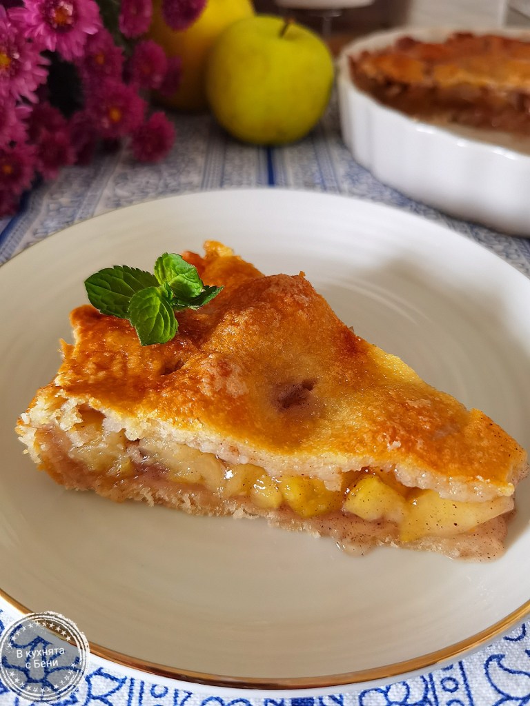 Десертът днес е ябълков пай, но в по-икономичен вариант, тъй като се приготвя с олио, а не с масло. Точно такъв си представях пълнежа, а коричката му е хем хрупкава, хем мека. Вкусен е за хапване и топъл и студен. 😋🍏🥧🍴😍🍁
