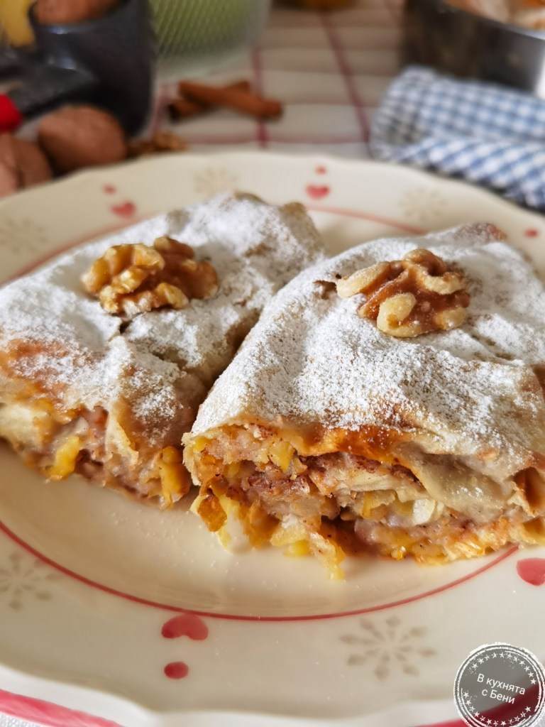 Намазах ги с останалата мазнина и сложих да се пекат в загрята на 180 градуса фурна. На 15-тата минута баницата доби загар и я покрих с парче алуминиево фолио, за да се задушат добре ябълките. Пекох още 35 минути, като общото време бе около 50 минути. Леко я охладих и поръсих с пудра захар. Нямахме търпение и разрязахме баницата още топла, но е още по-вкусна охладена.