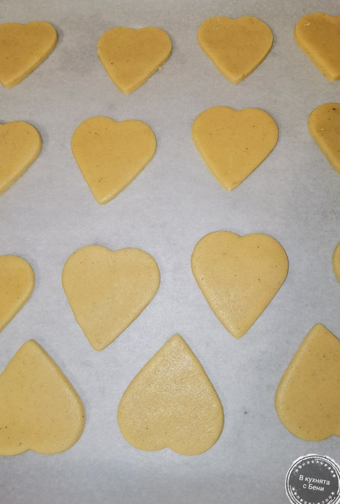 Тестото увих във фолио за свежо съхранение и прибрах в хладилника за 1 час. След това време го разопаковах и разрязах на две, за да е по-удобно за работа. Върху набрашнен плот разточих едната половина, като целях дебелина 5 мм. Изрязах меденки с форма сърце. Тавата на самата фурна покрих с хартия за печене и в нея разположих изрязаните сърца. Сложих тавата в добре загрята на 180 градуса фурна и пекох за кратко, около 8-9 минути. Тук е най-важния момент, за да останат меки меденките. Целим светъл цвят, а не златист. Не е добра идея да правите нещо друго, докато се пекат, защото трябва да бъдат под наблюдение. Всъщност подготвих втората партида сърца през това време, наблюдавайки какво се случва във фурната.