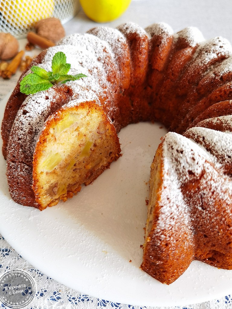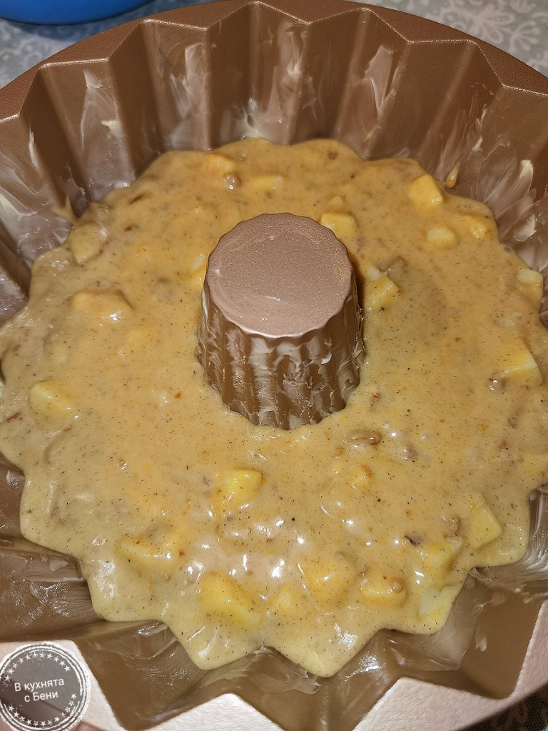 Орехите разбърках с канелата и ги добавих в купата със сместа, след което разбърках. Ябълките обелих и нарязах на малки парченца, които също добавих към сместа и я разбърках окончателно. Форма за кекс с диаметър 23 см. намазах с масло и в нея разпределих сместа.