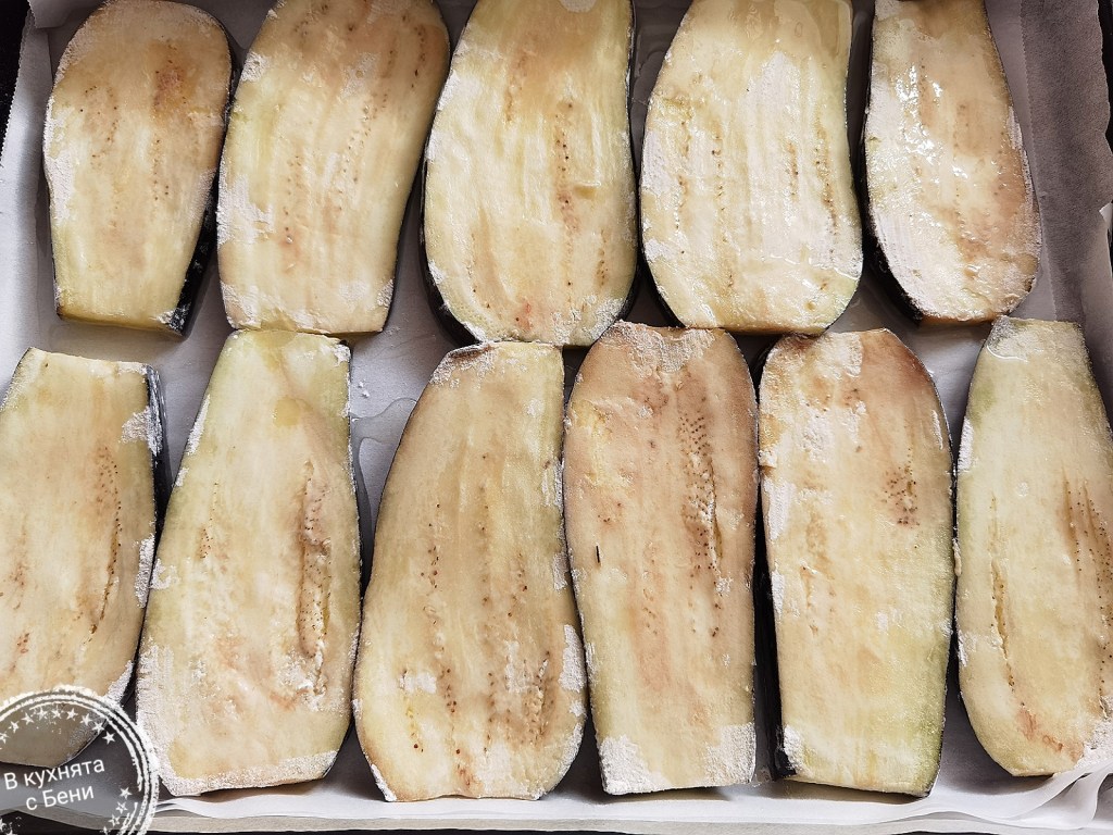 Патладжаните измих, подсуших и нарязах на филии с дебелина 1 см. Посолих ги и оставих изправени в купа за не по-малко от 30 минути, за да пуснат горчивия си сок. След това време ги измих и отцедих. Голямата тава на фурната покрих с два листа хартия за печене, което покапах с олио. Фурната загрях на 200 градуса. Върху парче алуминиево фолио сложих брашното. Всяка филия патладжан овалях от двете страни в брашното, леко отръсквах и подредих в тавата. Отгоре покапах още малко олио и с помощта на силиконова четка ги намазах добре. Сложих патладжаните да се пекат за около 30 минути, или до апетитен загар. Извадих ги в чиния и по същия начин процедирах с останалите няколко филии патладжан.