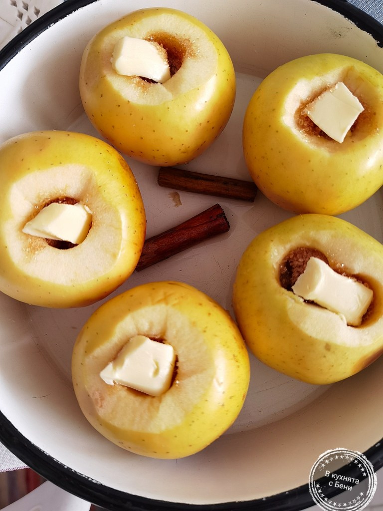 Ябълките измих добре, подсуших и със специален прибор отстраних семенната им част. Купих си този прибор преди седмица и наистина върши чудесна работа. С остър нож изрязах малко от кората, която е близо до отвора, с надежда да не се разпукат при печене /е, някои се разпукаха, но ги изядохме със същия ентусиазъм като другите 😃/. Подредих ябълките във висока тавичка с размер, помагащ да се опират една в друга и да се минимизира шансът да се разпаднат. В отвора на всяка сложих стафиди, малка лъжичка захар и парченце масло. На дъното на тавичката сложих канелата и полях с рома и 100 мл. вода. Сложих ябълките да се пекат в загрята на 170 градуса фурна за около 30 минути, или до видима готовност.