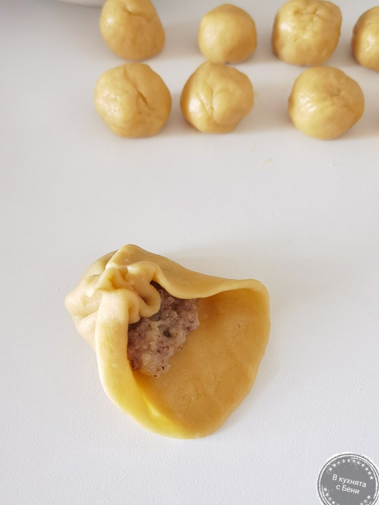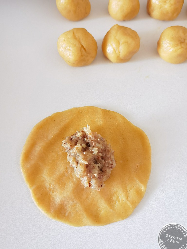 Фурната загрях на 170 градуса. Голямата тава на фурната покрих с хартия за печене. От тестото започнах да взимам малки късчета, които оформих като топчета с големина на средно голям орех. С пръсти и длани притиснах тестото върху плота и го изтъних до диаметър 8 см. В центъра му сложих непълна лъжичка от сместа и внимателно повдигнах края, затваряйки сладката. Надявам се от приложените снимки да става ясно. 🙂 Всъщност трябваше да се получат розички, но аз ги затворих май повече, отколкото трябваше.