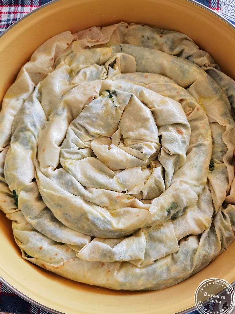 Дъното на тава с диаметър 33 см. покрих с хартия за печене, която изрязах със същия размер и форма. Намазах я както и стените с мазнина от канчето. Корите бяха три много големи, поради което всяка разрязах на две, като така се образуваха два полукръга. Взех първия полукръг и разпределих 1/6 та от сместа. Завих на дълго руло и бързо го разположих в тавата. По този начин процедирах и с останалите кори. На финал намазах баницата с останалата мазнина и я сложих да се пече в загрята на 170 градуса фурна за около 35 минути, или до апетитен загар и видима готовност. Оставих я леко да се охлади и поднесох с усмивка.