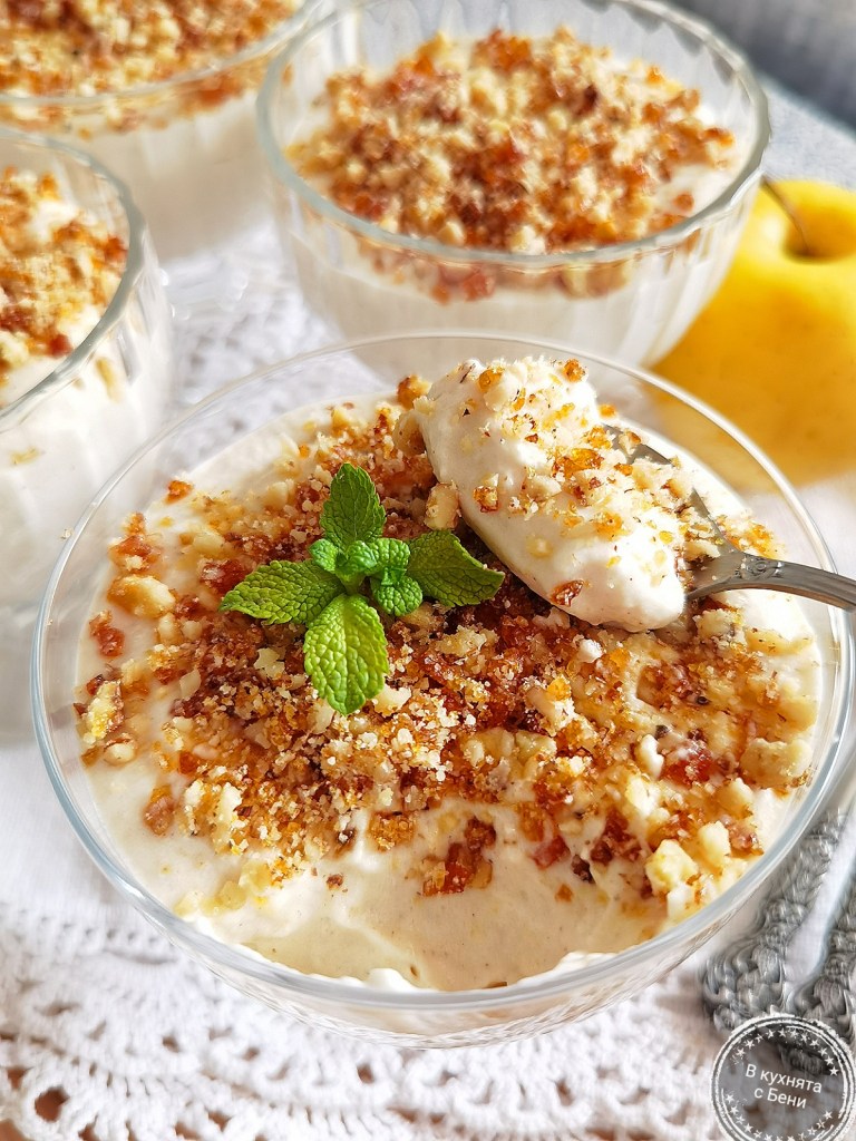 Пасирах ги, след което добавих ванилията и заквасената сметана. Разбърках за кратко с лъжица. В друга суха купа разбих добре охладената течна сметана, като към края добавих пудрата захар. Трябва да се получи плътен крем с връхчета. Към нея добавих ябълковата сме и разбърках с миксер за кратко, само колкото да се смесят. Разпределих крема в четири чаши, които сложих в хладилника, за да се охладят. През това време приготвих крокана, като в подходящ съд загрях захарта до разтопяването й и добавих ситно нарязаните орехови ядки. Разбърках бързо, за да поемат от карамела и сложих върху хартия за печене, намазана с масло. Когато изстинаха напълно, ги счуках на ситно.
