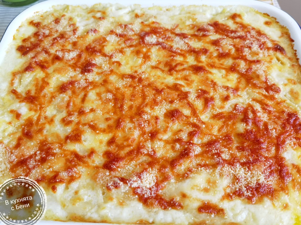 Пастата сварих в подсолена вода. Ние я предпочитаме добре сварена но без да е загубила целостта си. Междувременно в касерола загрях маслото и олиото и добавих брашното. Разбърках с кухненска бъркалка и когато сместа доби апетитен златист цвят, започнах да добавям от студеното прясно мляко. Разбърквах и наливах, докато се образува рядък сос. Добавих черния пипер и 2/3 от настърганите сирена. Разбърках, докато се разтопиха и сместа се сгъсти.