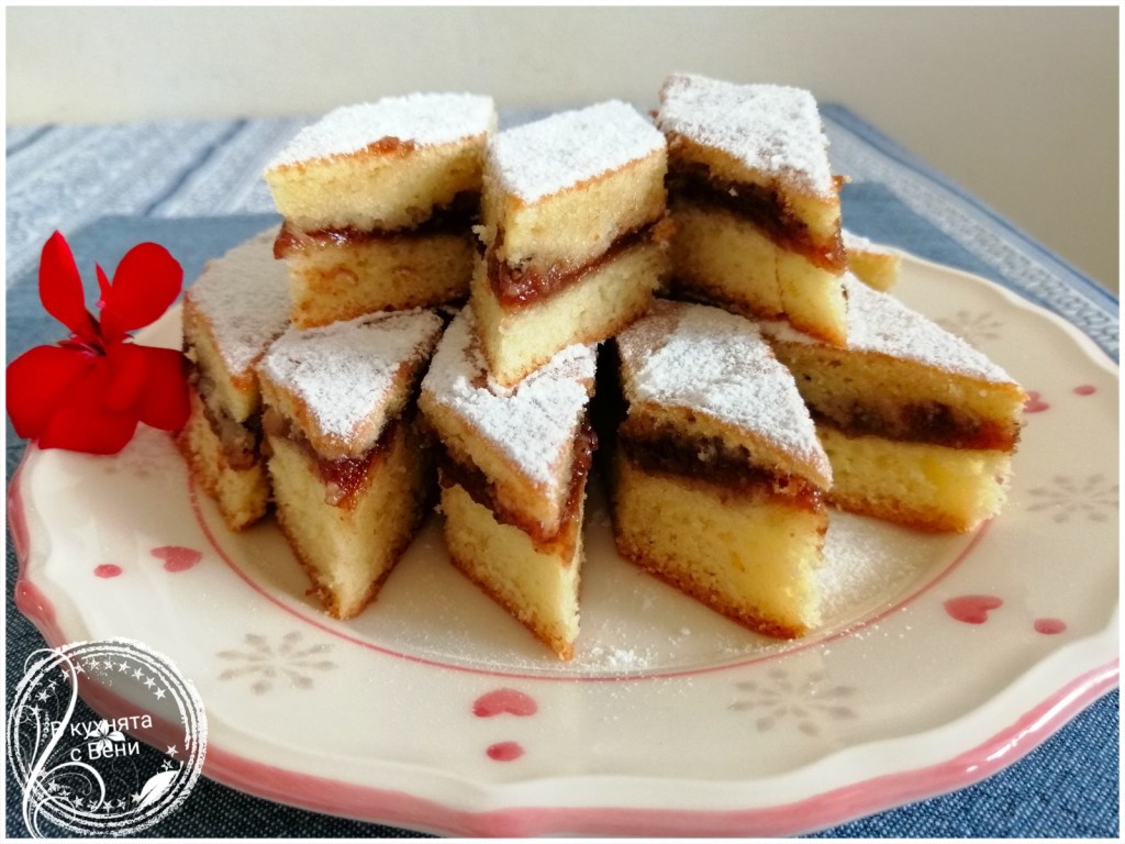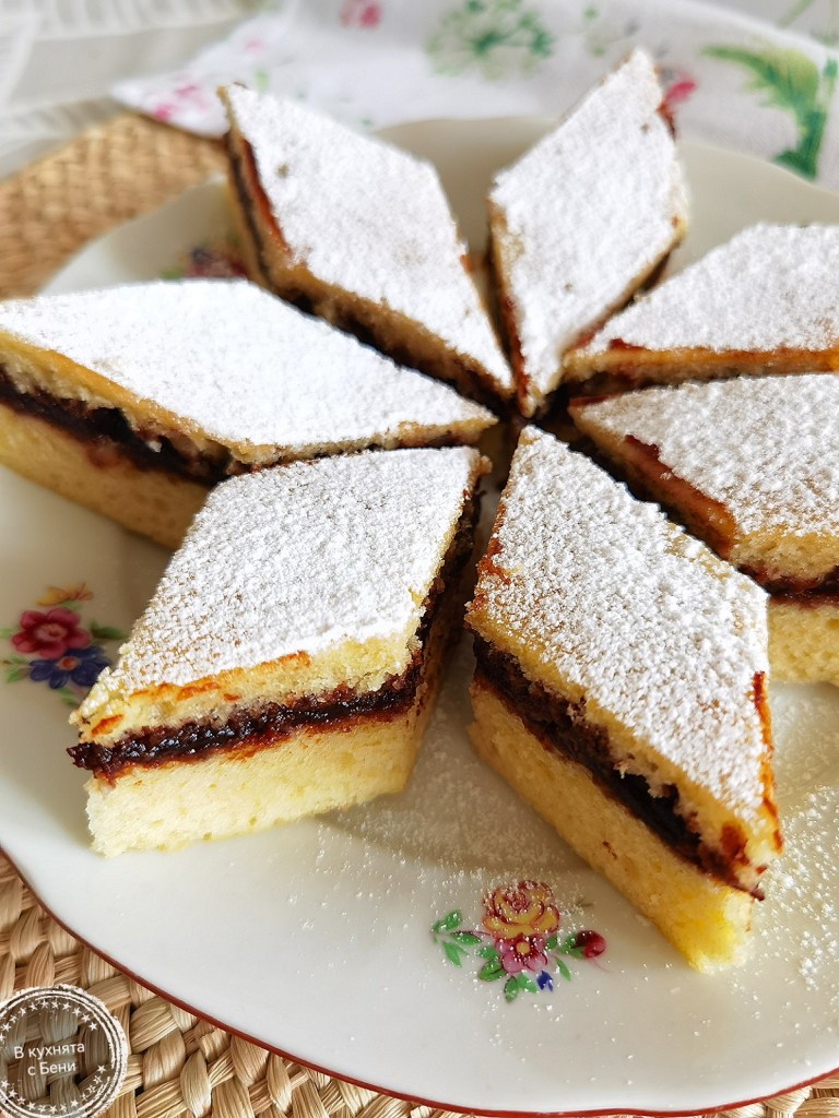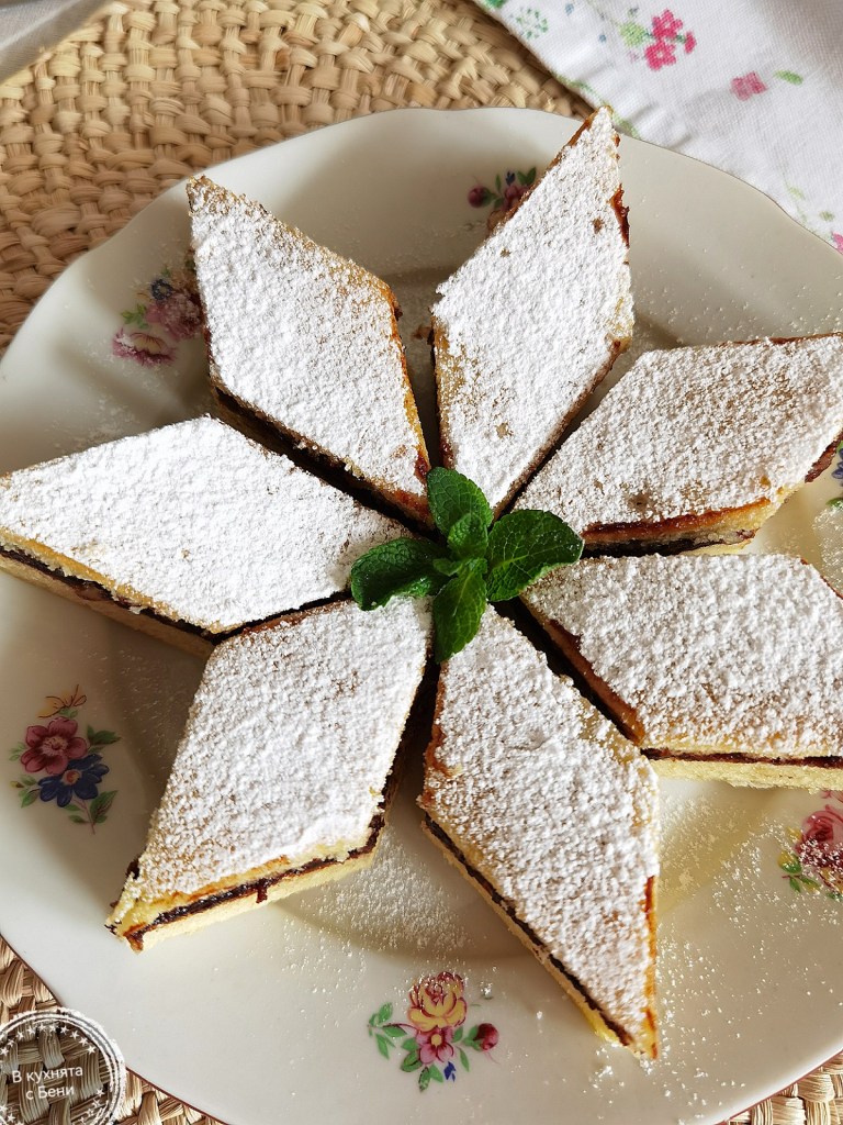 Оставих го да изстине напълно и поръсих с пудра захар, след което го нарязах на малки ромбове.
