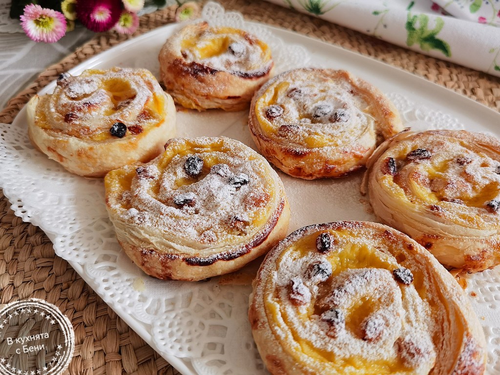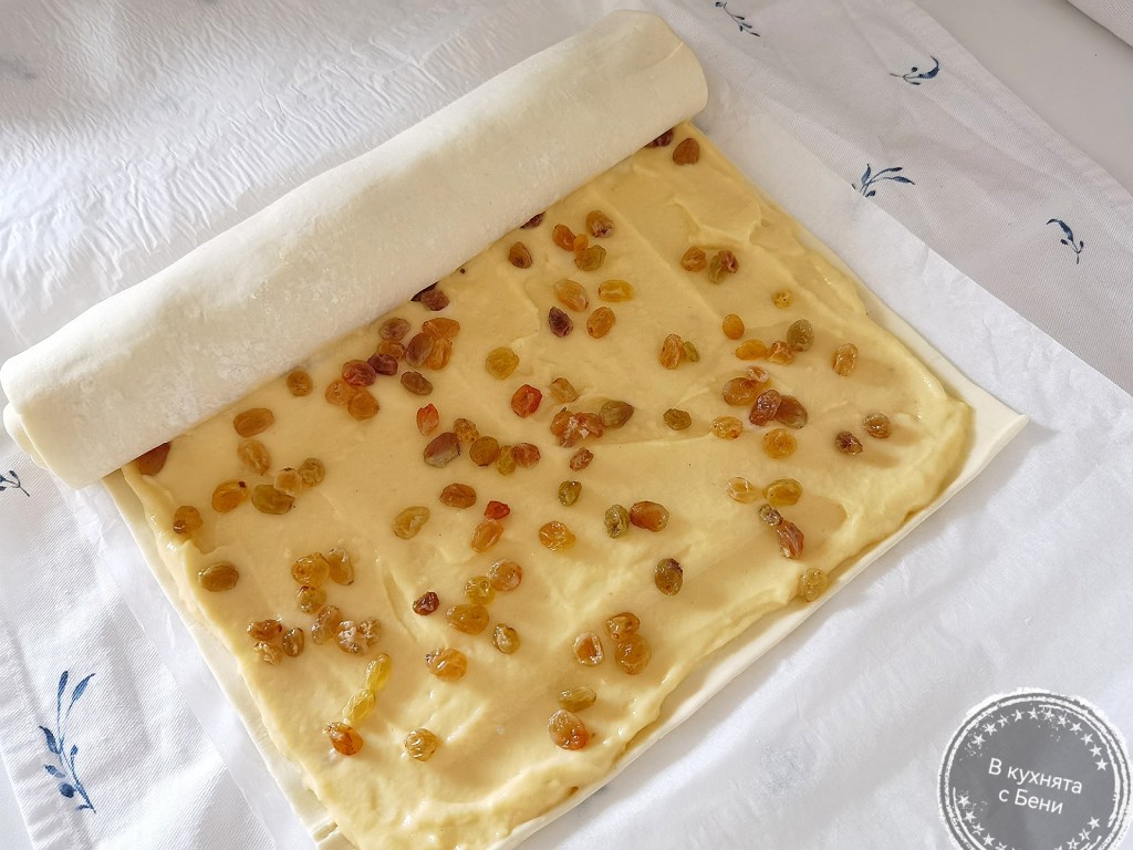 Разгънах бутер тестото и го намазах равномерно с крема. Поръсих със стафидите и навих на стегнато руло по късата страна, така че да се получат повече навивания. Рулото е меко, но това да не ви тревожи. С остър нож /ползвах къдравия за хляб/ нарязах на охлювчета с дебелина 1.5 см. и не повече от 2 см. С ловко движение ги сложих легнали в тавата и дооформих в по-кръгла форма. Когато тавата бе пълна, сложих сладкишите да се пекат в напълно загрятата фурна за 25 минути или до видима готовност и апетитен загар. При работа с бутер тесто е по-добре да се препекат, отколкото да останат сурови.
