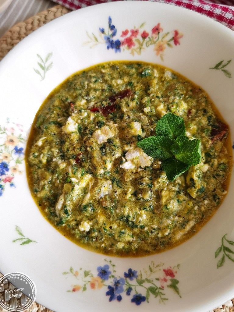 Копривата почистих от дръжките и накиснах в студена вода за 10 минути, за да се отделят песъчинките и други евентуални замърсявания. През това време в тенджера загрях 1 литър вода с 1 ч.л. сол. Сложих отцедената коприва във врящата вода и готвих не повече от 2-3 минути. През това време в купа подготвих студена вода и кубчета лед. Водата от варенето на копривата запазих. Омекналата коприва отцедих в гевгир и веднага прехвърлих в ледената вода. Идеята на това е да запази възможно повече зеления си цвят. Докато копривата се охлаждаше, в дълбок тиган тип уок с керамично покритие загрях олиото и маслото и сложих ситно нарязания лук, накъсаната на малки парченца суха чушка и посолих. Готвих на средна степен на котлона, докато лукът омекна и започна да добива златист цвят. Тогава прибавих добре отцедената и нарязана на дребно коприва, пресованите скилидки чесън и стрития сух джоджен. Готвих още не повече от минута, след което добавих червения пипер и брашното. Разбърках бързо и започнах да добавям от горещата отвара на копривата. При мен бяха нужни 750 мл. течност, за да се получи рядка каша. Намалих с една степен котлона и готвих около 8-10 минути. Яйцата разбърках в купичка и добавих към врящата гозба, като ги разбърквах непрестанно. Отне не повече от 2 минути, за да се сготвят, след което отстраних съда от котлона. Сиренето намачках и добавих към ястието, след което разбърках.
