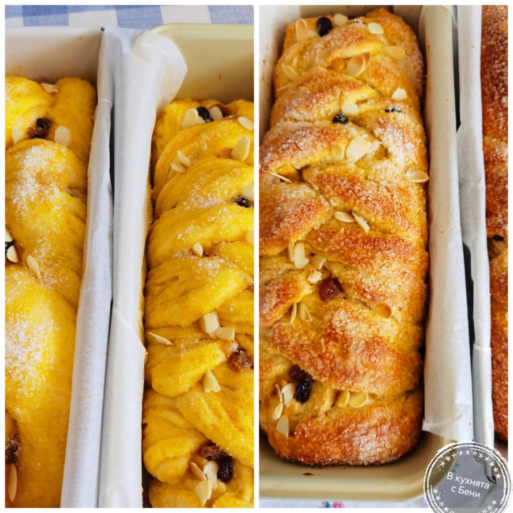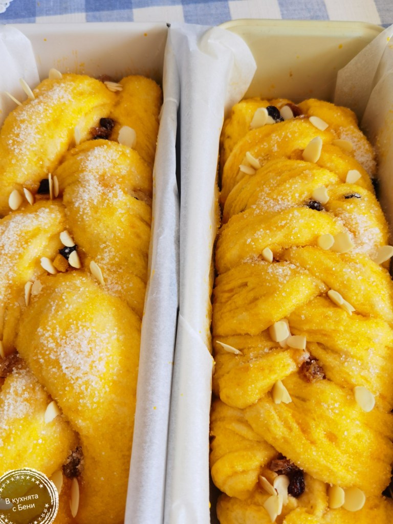 Вторите топки също разточих нагоре и настрани под формата на правоъгълник. Първия правоъгълник намазах с малко от отделената мазнина и отгоре разпределих отцедени сушени плодове, след което покрих с втората разточена платка, леко намазах с мазнина и сложих още сушени плодове /оставих си малко за отгоре на козунаците/, след което покрих с последната платка, която оставям без да я намазвам. С точилка или с ръце дооформих трипластовия тестен правоъгълник и с остър нож направих прорези. Започнах да ги прехвърлям един върху друг, образувайки плетка. На снимката се надявам да се вижда разбираемо. Тава оплетения козунак прехвърлих във втората форма, покрих с фолио за свежо съхранение и кърпа. Оставих върху топлата печка при другия козунак. Бяха нужни около 20 минути, за да втасат и да увеличат обема си. Когато това се случи, фурната загрях на 160 градуса. Отделения в началото жълтък разбърках с 1 с.л. хладка вода. С четка намазах козунаците, без да ги натискам много, след което ги поръсих със захар. Може да поръсих с повече захар, за да са още по-сладки. На няколко места сложих последните сушени плодове и забодох филирани бадеми.