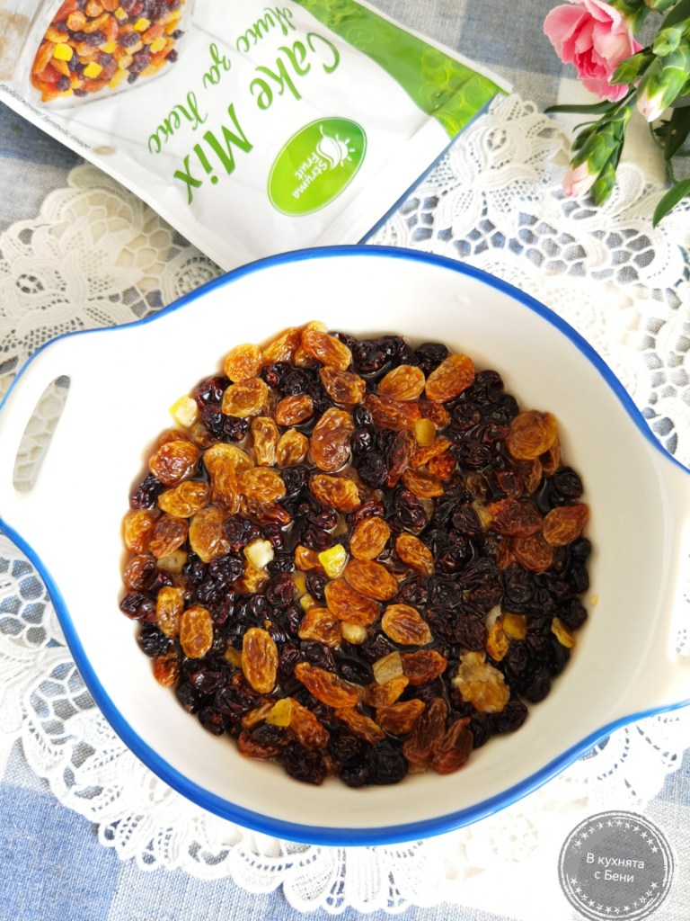 През това време в купичка сложих микса със сушени плодове и цитрусови корички и полях с рома и 4-5 с.л. хладка вода, като идеята е да са потопени напълно. Оставих ги, докато тестото втаса и ми потрябват.