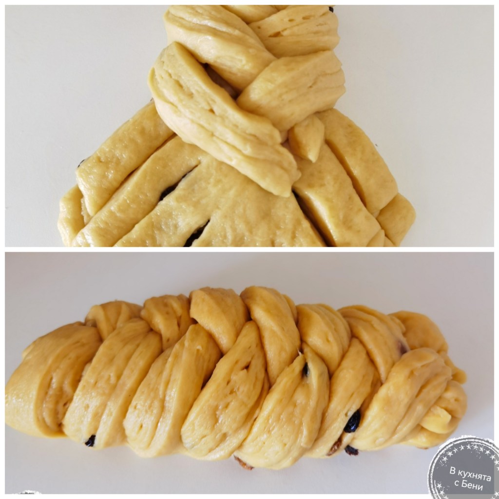 Първите три топки разточих нагоре и настрани под формата на правоъгълник /може да се разтеглят и с ръце/, с дължината една идея по-малка от тази на формата за печене. Разпределих от отцедените сушени плодове и завих на дълго руло /фитил/, което усуках. Усукването е важния момент, за да се получат конци в козунака! По този начин приготвих и другите две рула, след което от трите направих плетка /на снимката съм показала/. Така оплетения козунак прехвърлих във формата и покрих с фолио за свежо съхранение и кърпа. Оставих на топло върху печката.