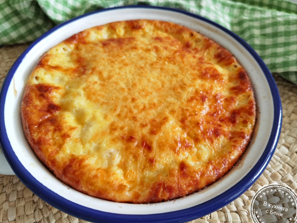 В купа сложих яйцата, пресятото с бакпулвера брашно и мления пипер. С кухненска бъркалка ги разбърках до гладка смес. Добавих прясното мляко, разбърках до усвояването му и завърших с прибавяне на настъргания кашкавал. Разбърках и изсипах в малка тавичка, която намазах добре с масло. Сместа е леко течна, но това не трябва да ви безпокои.