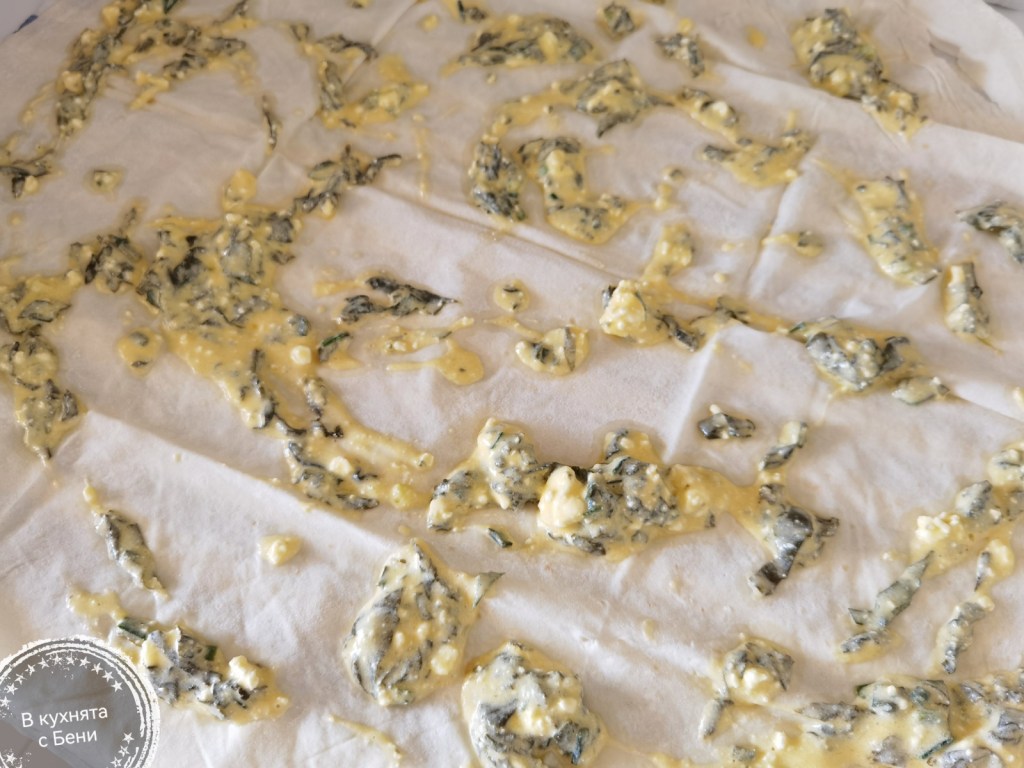 Дъното на тава с диаметър 29 см. покрих с хартия за печене, която изрязах със същия размер и форма. Стените и хартията намазах с отделената мазнина. Разгънах трите големи кори и ги сложих една върху друга. Върху най-горната разпределих 1/3-та от сместа и внимателно навих на руло, което прехвърлих в тавата, като го разположих в единия й край. По същия начин навих и другите две рула, като последното сложих в центъра. Намазах с последната мазнина и сложих баницата да се пече в добре загрята на 170 градуса фурна за около 25 минути, или до видима готовност и апетитен загар.