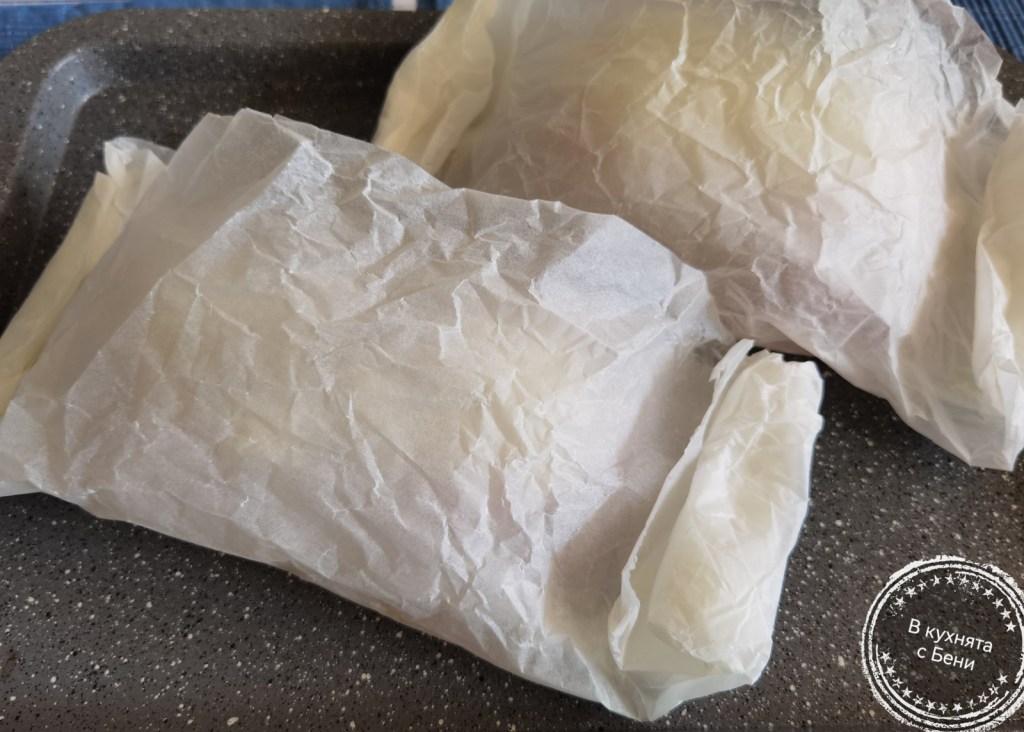 Пекох 20 минути, след което внимателно разтворих хартията, за да се запече кашкавалът. Това отне още около 10 минути.