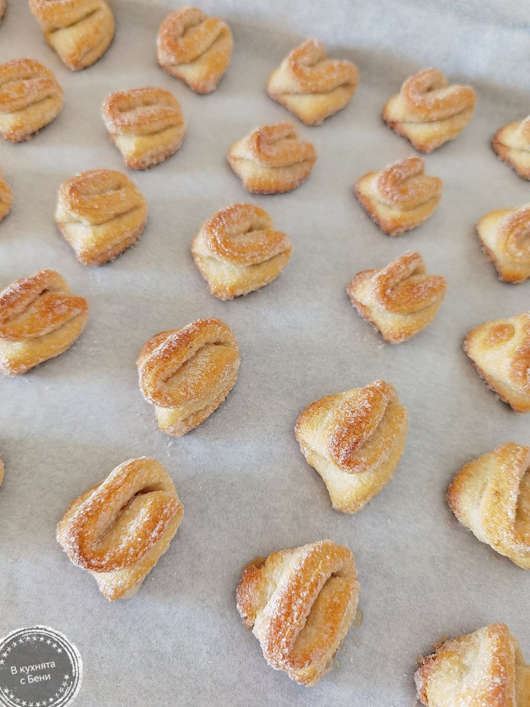 След това време голямата тава на фурната покрих с хартия за печене. Фурната загрях на 170 градуса. В малка чиния сложих половин чаша захар. Тестото разточих върху съвсем леко набрашнен плот на тънка платка с дебелина не повече от 2 мм. Важно е да не е дебела, защото сладките няма да се изпекат добре отвътре. С чаша с диаметър 6 см. изрязах кръгове. Всеки от тях овалях от двете страни в захарта, като леко притиснах, за да полепне добре по тях. Прегънах на две и след това на още две, притиснах ъгълчето и подредих в тавата. По време на печене сладките се надигат само нагоре, така че може да ги подредите близко една до друга.