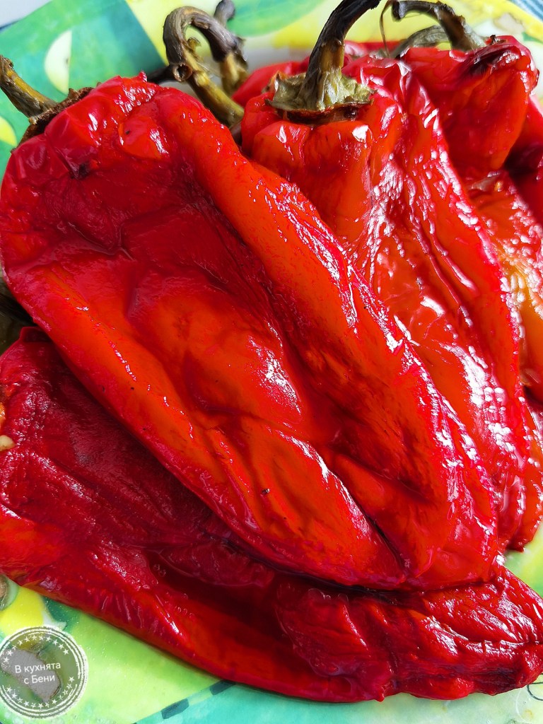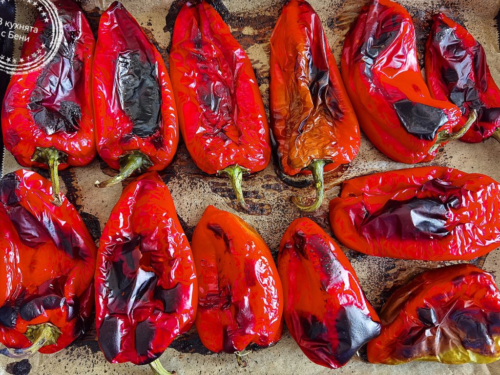 Фурната загрях на 220 гр. Пиперките измих, подсуших и подредих в голямата тава на печката, която предварително покрих с хартия за печене. Сложих ги да се пекат в напълно загрятата фурна за около 25-30 минути или до хубав загар. Внимателно ги обърнах и пекох още 10-15 минути. Изпечените пиперки сложих в тенджера, поръсена с малко сол, като на всеки ред от тях, посолих още малко. Така се белят по-лесно. Покрих тенджерата с фолио за свежо съхранение и ги оставих да изстинат напълно. Всъщност изпекох чушките късно снощи и на сутрина ги белих.