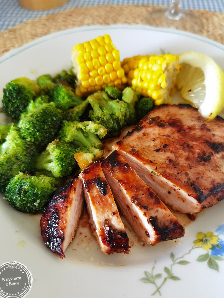 Сервирах парче пилешко, полято с малко сос и допълнено от броколи и парчета варена царевица.