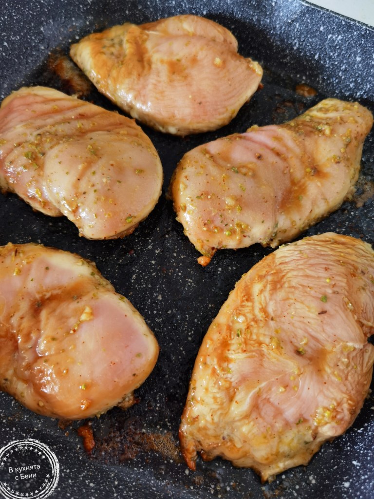 Дъното на грил тиган с керамично покритие намазах с малко олио и разположих част от пилешките филета. Принципно може и без мазнина да се пекат, но предпочитам да процедирам така.