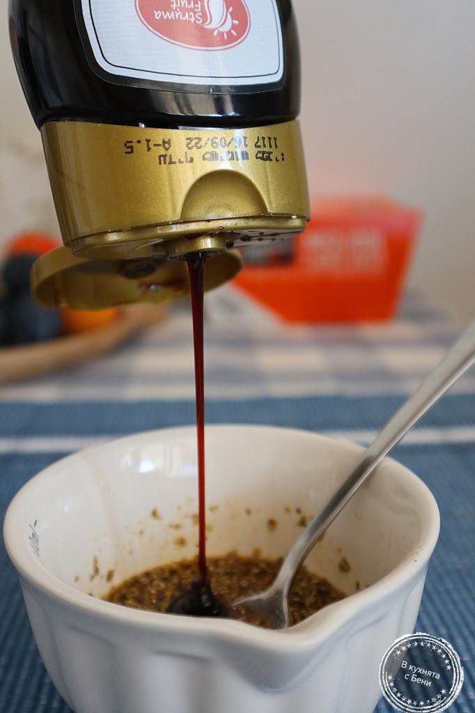 В малка купичка смесих соевия сос, пресования чесън, горчицата, сиропа от фурми, лимоновия сок, стрития сух риган, черния пипер и щипка сол. Разбърках добре и намазах пилешките филета от двете страни, като ги разположих в съда, в който ще престоят. Покрих с фолио за свежо съхранение и прибрах в хладилника за през нощта или не по-малко от 8 часа.