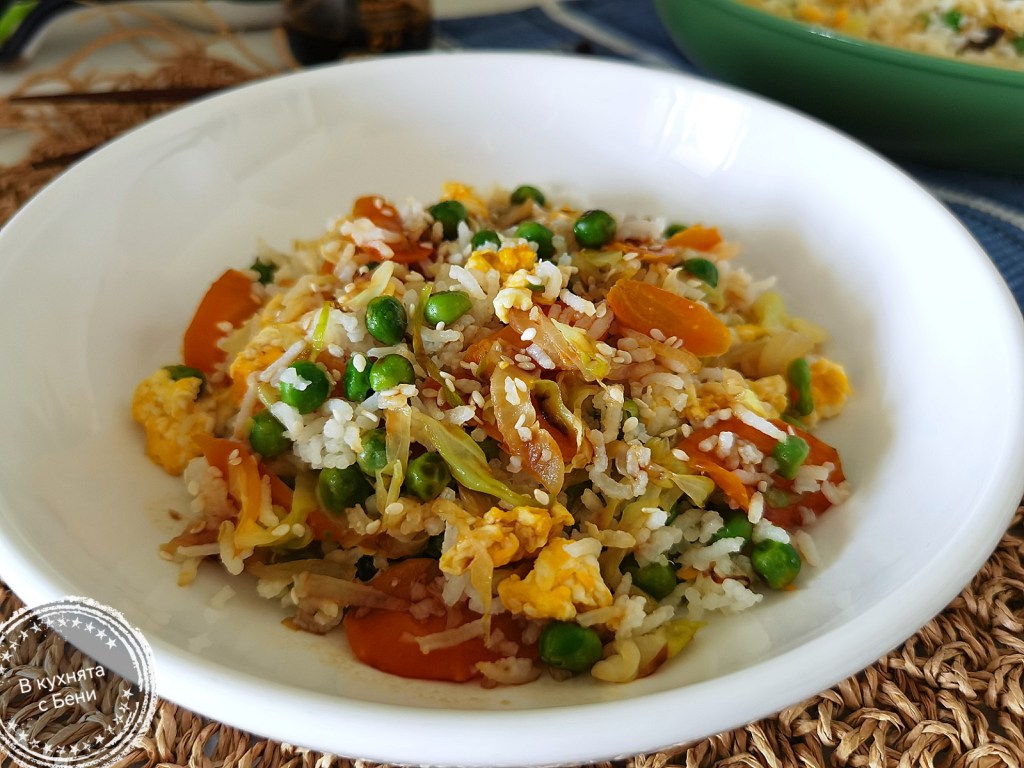 Оризът измих в гевгир тип цедка и сложих в средно голяма тенджера. Залях го с 1200 мл. вода и добавих сол на вкус. Сложих го да се вари, което отне 10-12 минути, от момента на завиране. Отцедих го добре. През това време в широк тиган с незалепващо /моето е керамично/ покритие загрях 3 с.л. олио и добавих нарязания на тънки полумесеци лук и нарязаните на тънки шайби моркови, като леко ги посолих. През цялото време готвих на най-високата 6-та степен на моята печка. След 2 минути добавих нарязаните на тънки ивици чушка и зеле. Разбърках добре и след 2-3 минути прибавих замразения грах. Разбърквах постоянно, за да се сготвят равномерно зеленчуците. Не съм добавяла вода, защото разчитах да се сготвят от соковете, които самите те пуснаха. След около 15 минути бяха готови, като е важно хем да са сготвени, хем да имат лека хрупкавост. Преместих зеленчуците в единия край на тигана, а в празното място капнах 2-3 капки олио и чукнах яйцето. Посолих го и разбърквах, до готовност, без да го пресготвям. Смесих го със зеленчуците, добавих ориза, разбърках внимателно и след 2-3 минути отстраних ястието от котлона.