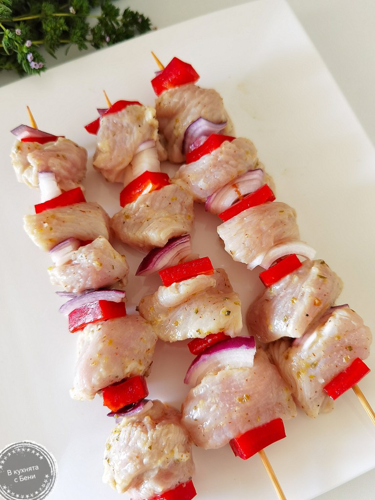 Чушката измих, подсуших и нарязах на парченца, една идея по-малки от размера на късчетата месо. Лука нарязах също на дребно. Може да сложите и други зеленчуци, но аз разполагах с тези. Нанизах късче пуешко, чушка и лук и така докато се запълни шишчето. Подготвих всички.