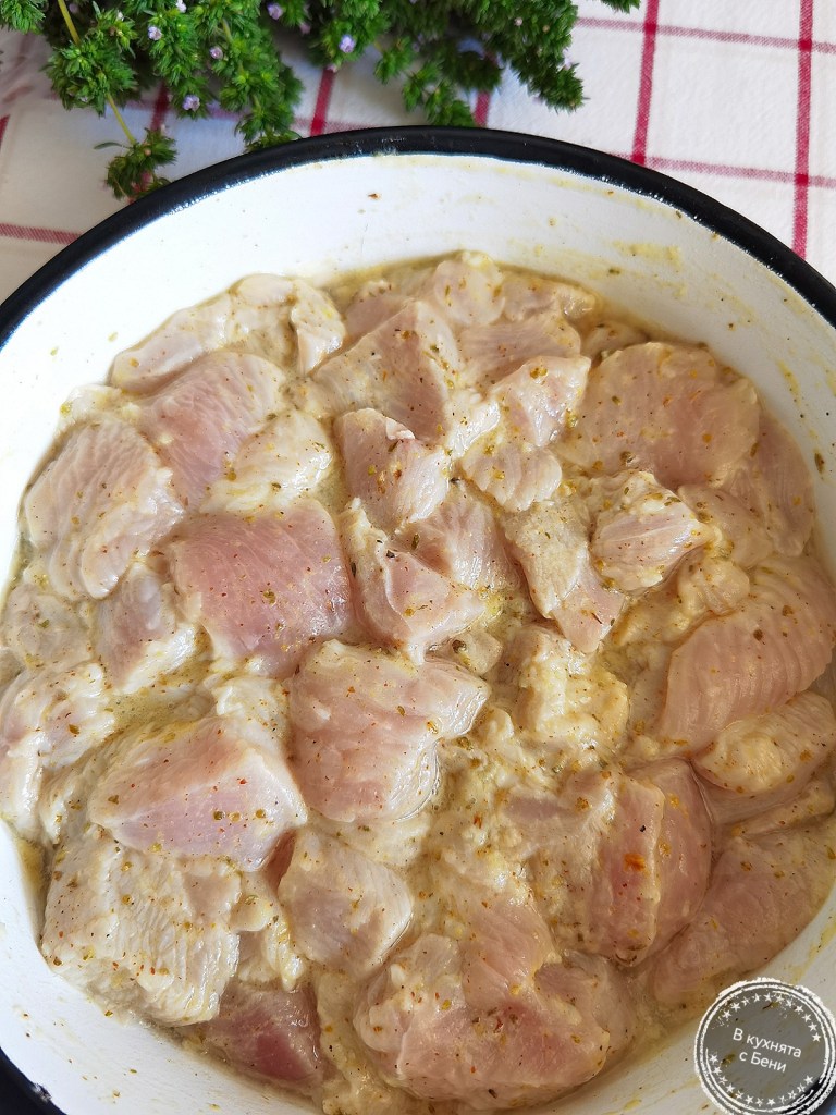 В купата, в която ще мариновам пуешкото смесих зехтина, лимоновия сок, горчицата, чесъна, сушения риган, черния пипер, солта и свежата мащерка. Разбърках добре и добавих късчетата месо. Разбърках, за да поемат равномерно от маринатата и покрих купата с фолио за свежо съхранение. Прибрах в хладилника за през нощта или не по-малко от 4-5 часа.