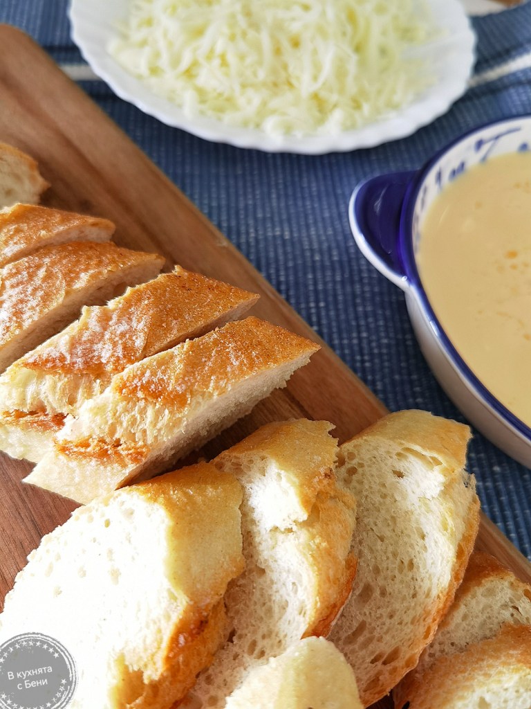 Франзелата нарязах леко под наклон на филийки с дебелина 2 см. Важно е, да не са много тънки! Тавата на фурната покрих с хартия за печене, а самата фурна загрях на 180 градуса. Всяка филийка потопих за около 4 секунди на страна в млечната смес и разположих в тавата. Когато всички бяха готови, ги покрих с настъргания кашкавал и сложих да се пекат в загрятата фурна за около 15 минути или до апетитен загар и видима готовност.
