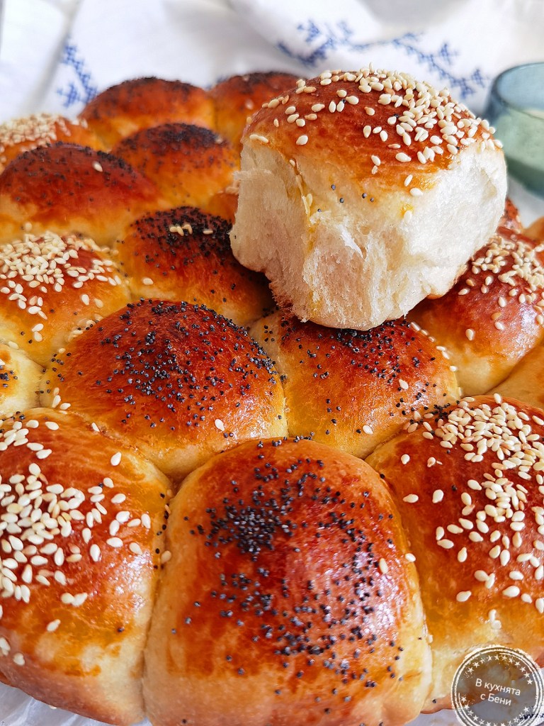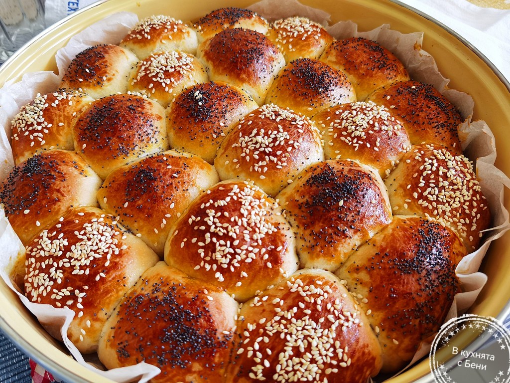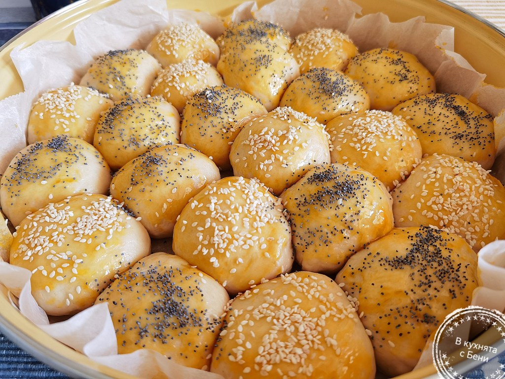Всяко парче тесто оформих на топче, като краищата му подпъхвах от долната му страна. Така става гладко от горе. Слагах готовите топчета в тавата, като между тях оставях съвсем малко място. Покрих отново с фолио за свежо съхранение и кърпа и оставих близо до печката за около 15- 20 минути или докато видимо започнаха да увеличават обема си. Пекох ястие във фурната и затова върху нея бе топло и това спомогна процеса.