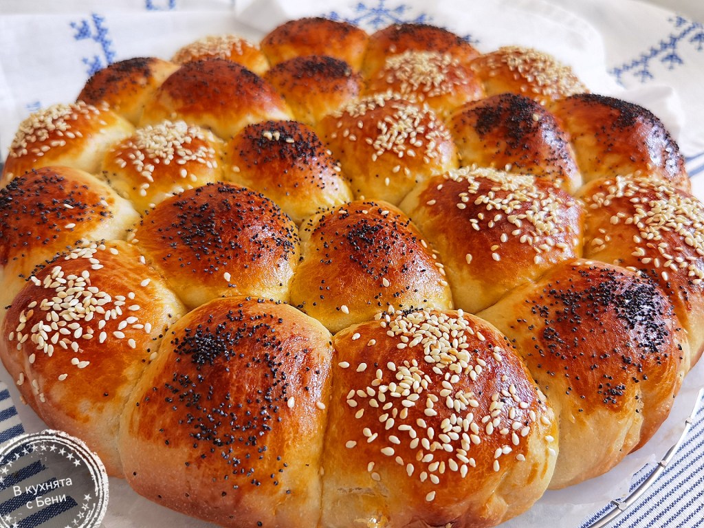 Втасалите топчета намазах с жълтъка смесен с олиото, като ползвах силиконова четка. Поръсих със сусам и мак и сложих такава в загрятата на 180 градуса фурна за 35-40 минути, като на 15-тата минута покрих с алуминиево фолио, тъй като отгоре памук погачата доби златист загар и можеше да загори, докато се изпече и от вътре. Такъв тип печива винаги пробвам, като почукам върху тях и ако са готови „бият на кухо“. Оставих готовата погача да се охлади в тавата за 10 минути, след което заедно с хартията я преместих върху метална решетка, за да изстине напълно. Разбира се, опитахме я още топла и се насладихме на разкошната й текстура и вкус.