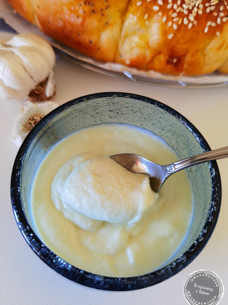 Чесънът обелих, измих, подсуших и нарязах на дребно. В стъклен буркан сложих олиото, чесъна, солта и лимоновия сок. Започнах да пасирам, като първо за кратко задържах на дъното и постепенно започнах да изтеглям нагоре. Не се получава като при майонезата, а е нужно да се пасира с движения нагоре и надолу, докато се получи гладката текстура. Затворих буркана с капака и оставих в хладилника за 1 час преди да се консумира.