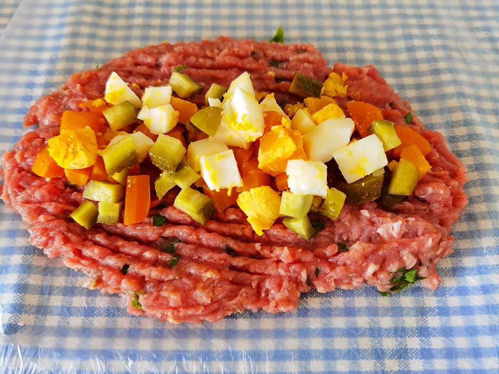 Мляното месо сложих в подходящ съд, посолих, поръсих с черния пипер и добавих яйцата, ситно нарязания магданоз и галетата. Омесих добре, покрих с фолио за свежо съхранение и оставих в хладилника, докато приготвя останалите продукти.