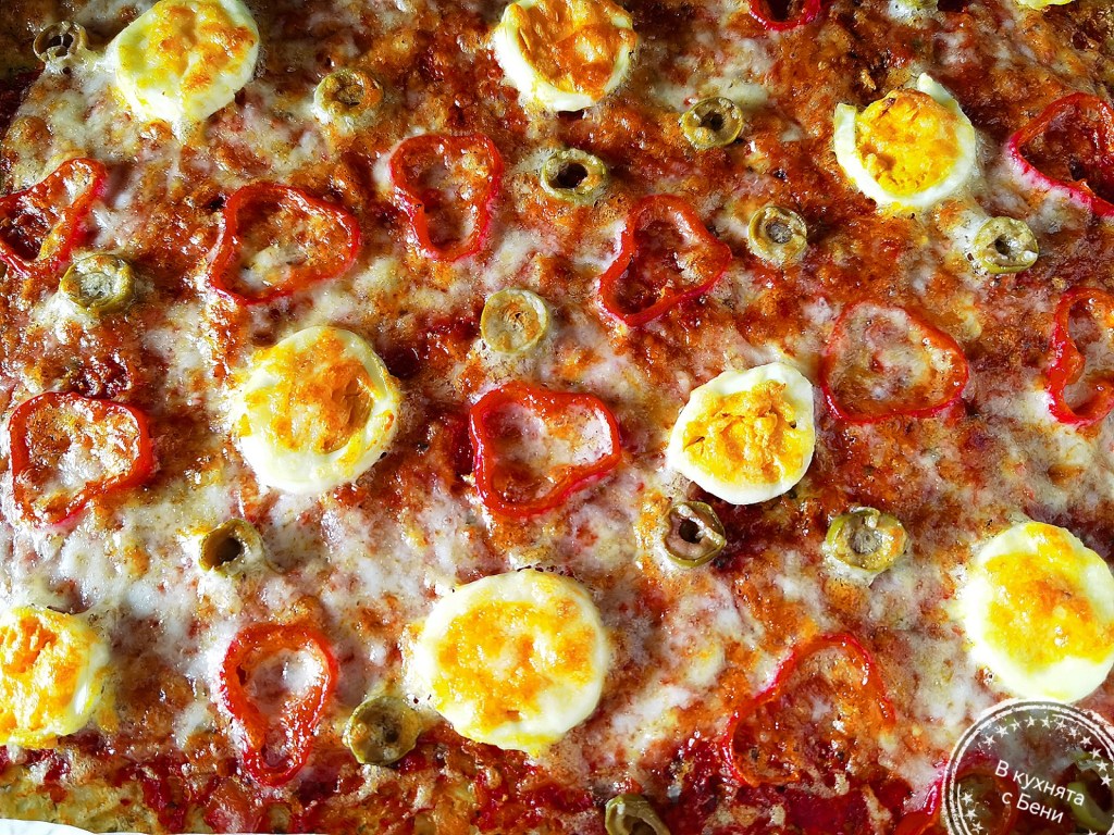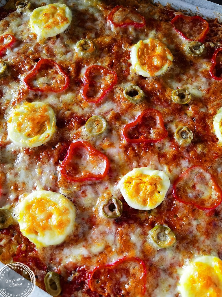 Извадих тавата и намазах блата равномерно с доматения сос. Отгоре подредих резените яйца, маслини, пиперка и върнах във фурната за 10-ина минути, за да се запекат, след което поръсих с настъргания кашкавал и допекох до златиста коричка.