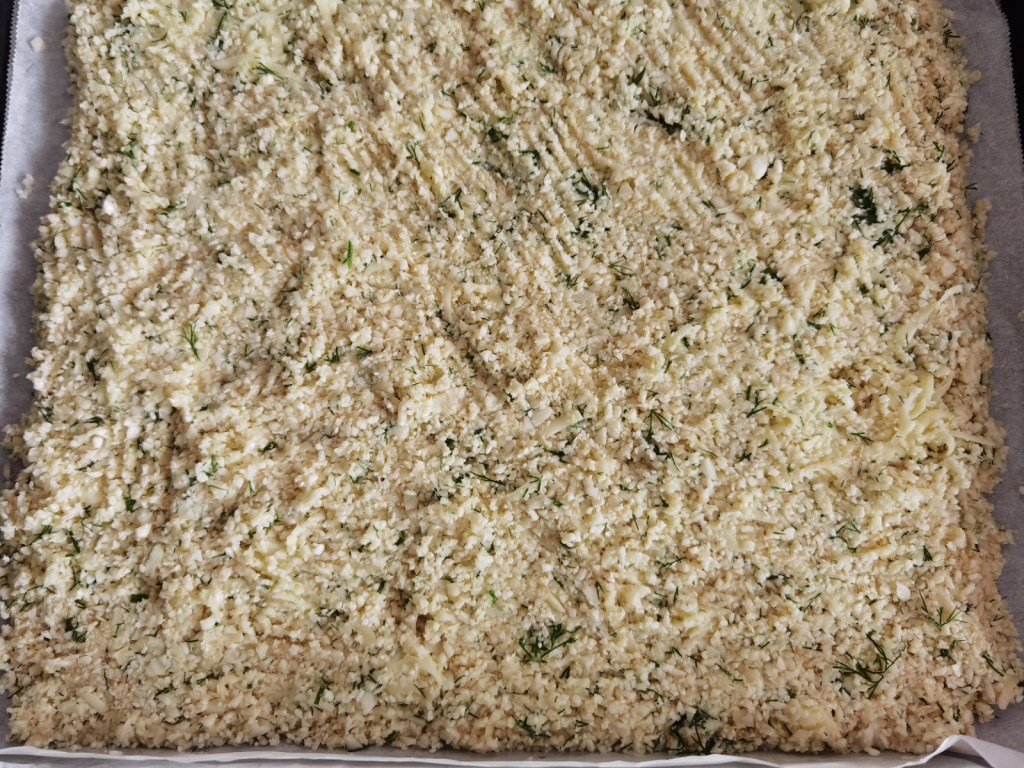 Голямата тава на фурната, която е с размер 43х33 см. покрих с два листа хартия за печене, които намазах с масло. Разпределих карфиолената смес и я притиснах, за да се получи тънък и равномерен пласт. Сложих блата да се пече в напълно загрятата на 190 градуса фурна за около 30 минути или до видима, пълна готовност и апетитен загар.