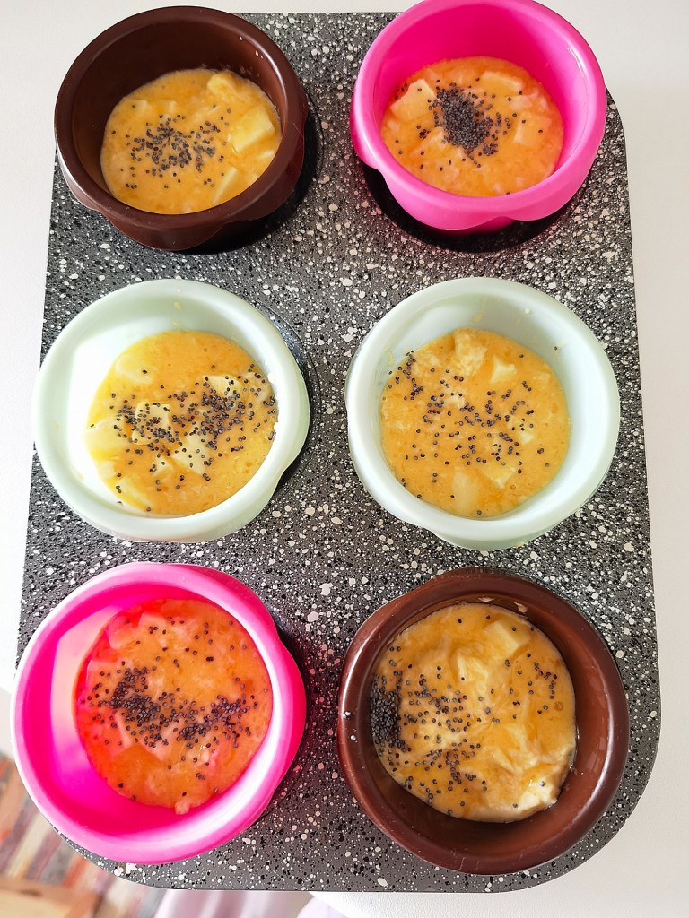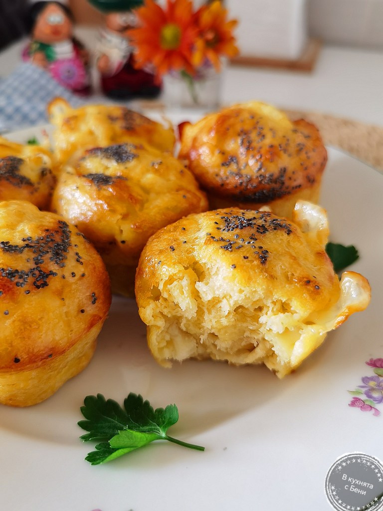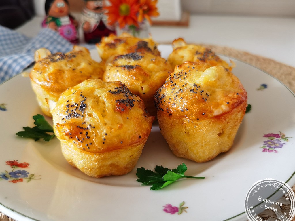 Корите накъсах на тънки ленти. В подходящ съд сложих киселото мляко и содата, разбърках и след като шупна, добавих яйцата, щипка сол и отново разбърках. Прибавих нарязания на съвсем малки кубчета кашкавал, разбърках и финално добавих корите, като разбърках добре, докато се разпределят в сместа. Силиконовите форми намазах с разтопено масло, като останалото добавих в сместа и разбърках. Разпределих равномерно сместа във формите и поръсих с малко макови семена.