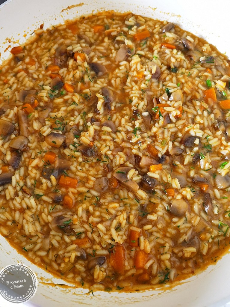 В голям керамичен тиган загрях 4 с.л. олио. Задуших лука и моркова, като леко посолих. Когато омекнаха и морковът пусна красивия си цвят, добавих ситно нарязаните дръжки на копъра и гъбите. Готвих докато останаха на мазнина, след което прибавих доматеното пюре и след 1 минута и ориза. Готвих 1-2 минути и започнах да наливам по малко от горещия бульон, като разбърквах често. Степента на котлона бе 4 от 6 на моята печка, като на финал намалих на 3-та степен и сложих леко открехнат капак. Когато ястието пое целия бульон и оризът бе готов, отстраних от котлона и поръсих със ситно нарязаната листна част на копъра.