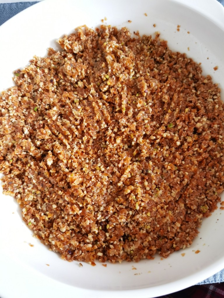 Изстиналите кори начупих с ръце, като целях да са възможно най-фини. Това е много важно за крайния резултат. Цели се текстура на галета. Сложих ги в купа и добавих смлените ядки и течния мед.