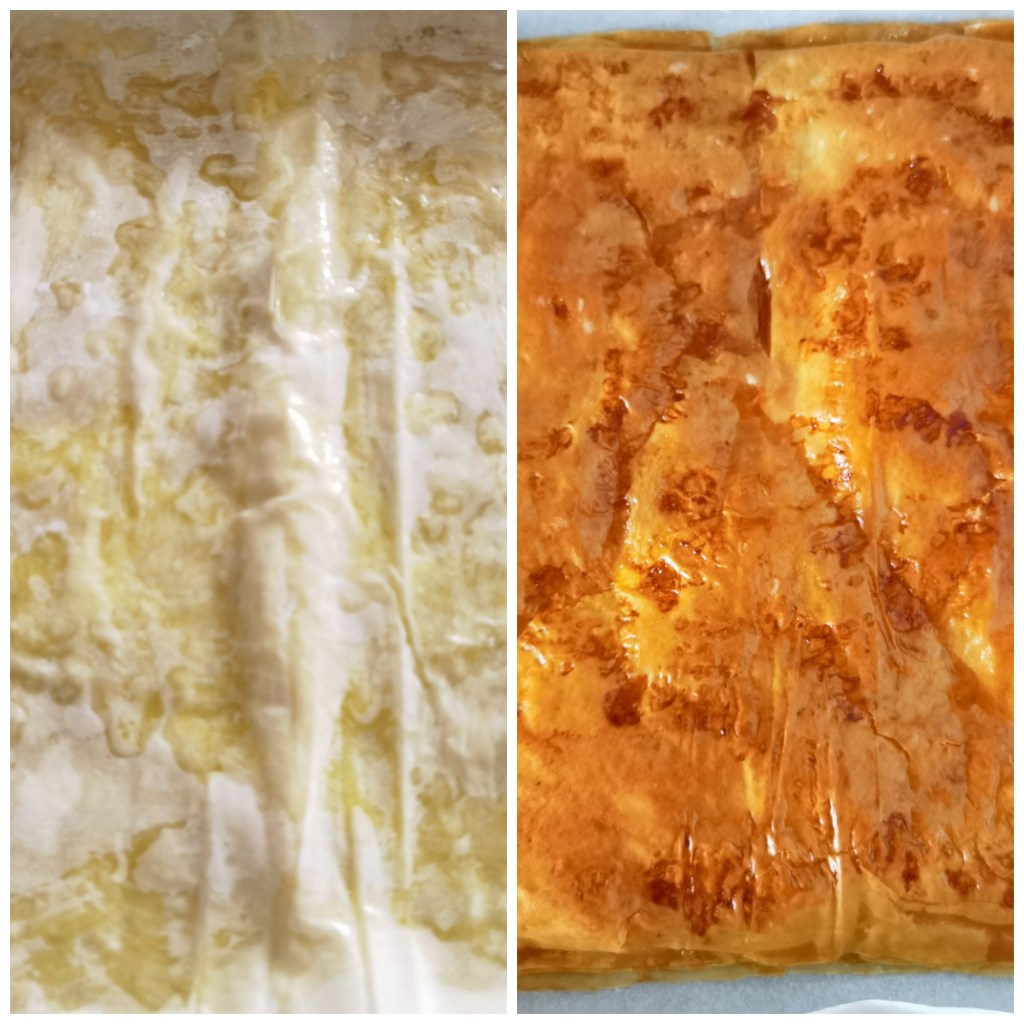 Фурната загрях на 170 градуса. Голяма тава покрих с хартия за печене и сложих първата кора. С помощта на силиконова четка я намазах добре и покрих с втора кора, която също намазах с разтопено масло. Така процедирах с петте кори. Сложих ги да се пекат в загрятата фурна за около 10-12 минути или до златист загар. След това оставих да се охладят напълно.