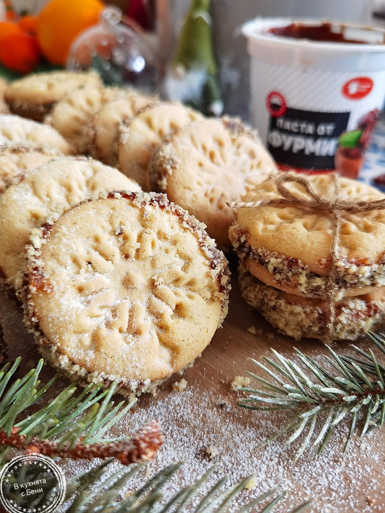 Готовите меденки прехвърлих върху метална решетка, а тавата заредих с новите, които посготвих междувременно и ги сложих да се пекат. Още топли, слепих медените с пастата от фурми, като при поставянето на горната меденка, леко притисках, за да излезе малко от пастата отстрани. Овалях в смлените орехи, като притискат, за да полепнат добре отстрани.