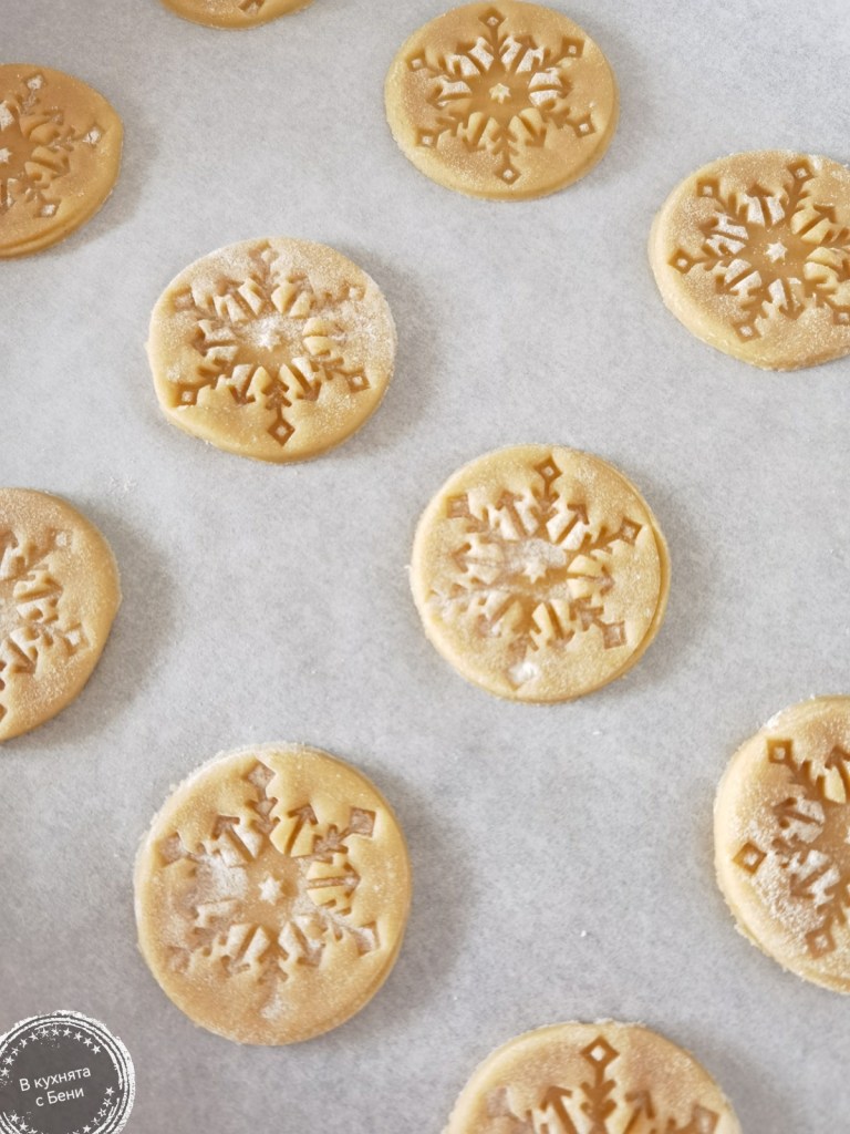 Избрах чаша със същия диаметър като този на печата, с който щампирах меденките. Печата потопих добре в малко брашно и натиснах върху тестото, което също съвсем леко бях поръсила с брашно. Това е важен момент, за да се получи хубава шарка и тестото да не полепне по печата. Направих щампа върху половината тесто, след което натиснах с чашата и така изрязах меденките. На снимките се вижда най-добре. От другата част разточено тесто изрязах с чашата долната част на меденките, като е важно да са равен брой с тези, които са щампирани. Това е важно, защото още топлите меденки се слепват. Прехвърлих ги в тава, покрита с хартия за печене и сложих да се пекат в загрята на 170 градуса фурна, за около 6-7 минути или до съвсем блед загар. Това е много важен момент, за да останат меки меденките. Целим светъл цвят, а не златист! Не е добра идея да правите нещо друго, докато се пекат, защото трябва да бъдат под наблюдение.